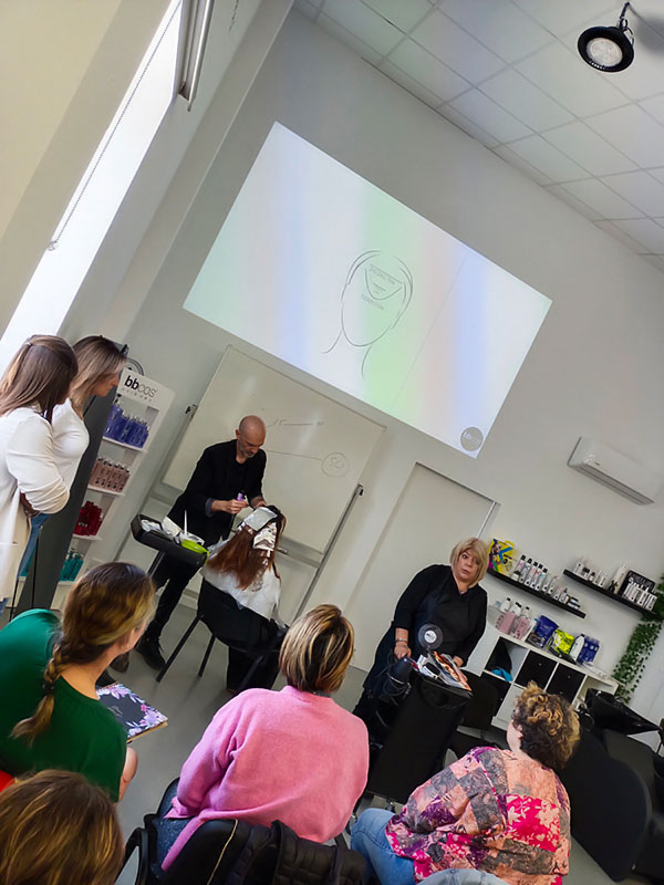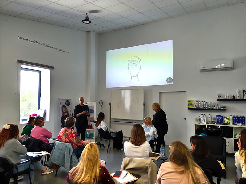 Los formadores combinaron proyecciones en Video Beam con demostraciones en vivo en modelos, utilizando productos BBcos. Los asistentes pudieron observar —y luego practicar— técnicas con materiales profesionales, destacando la fórmula vegana y la intensidad cromática de la marca.